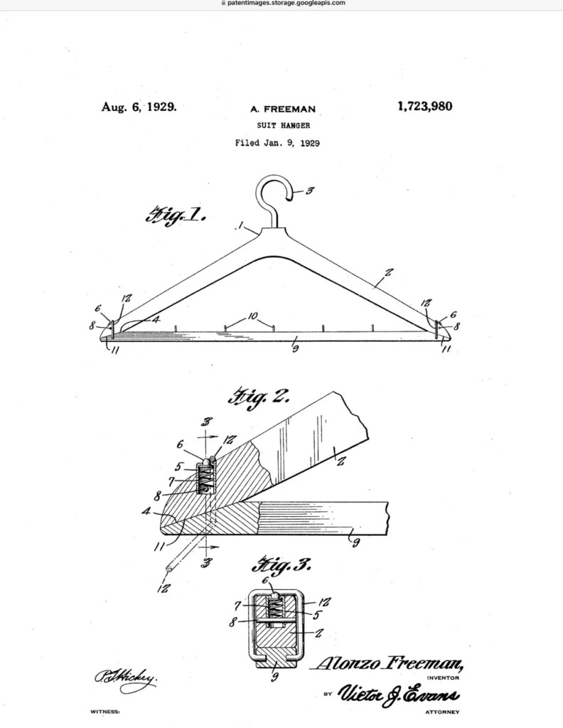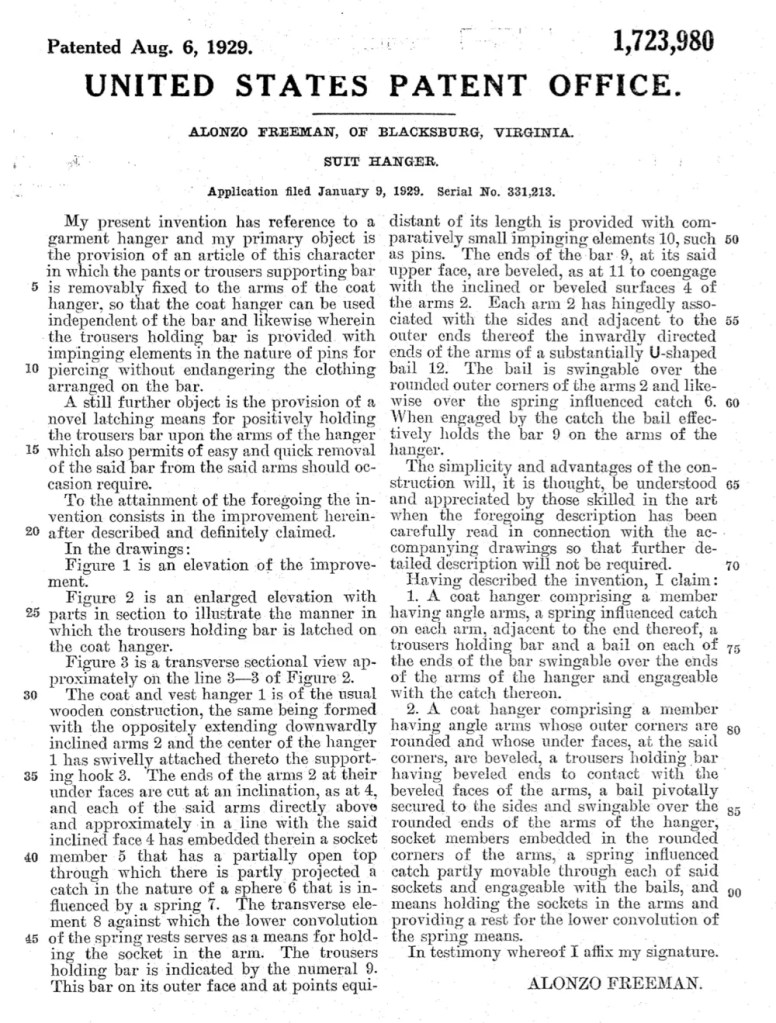 Working with coats, suits, and trousers, Freeman designed a better garment hanger. His invention included a removable bar for trousers and a simple latching mechanism that held the bar securely in place while still allowing it to be quickly removed.