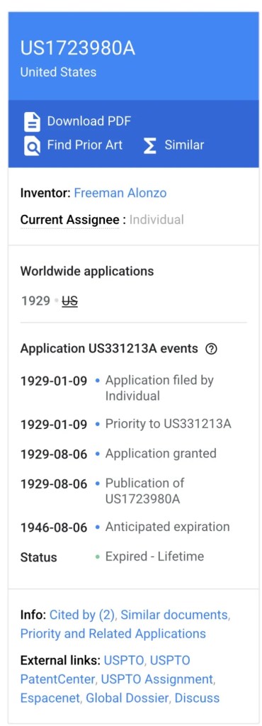 On January 9, 1929, Freeman filed for a patent with the United States Patent and Trademark Office. Later that year, on August 6, he was granted U.S. Patent 1,723,980.