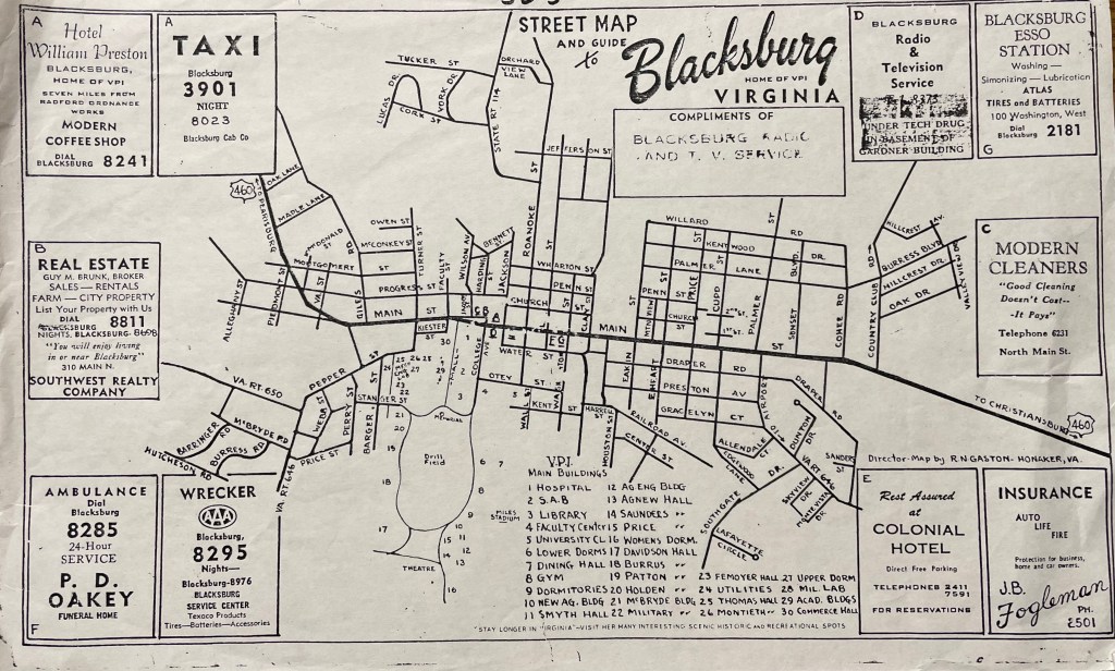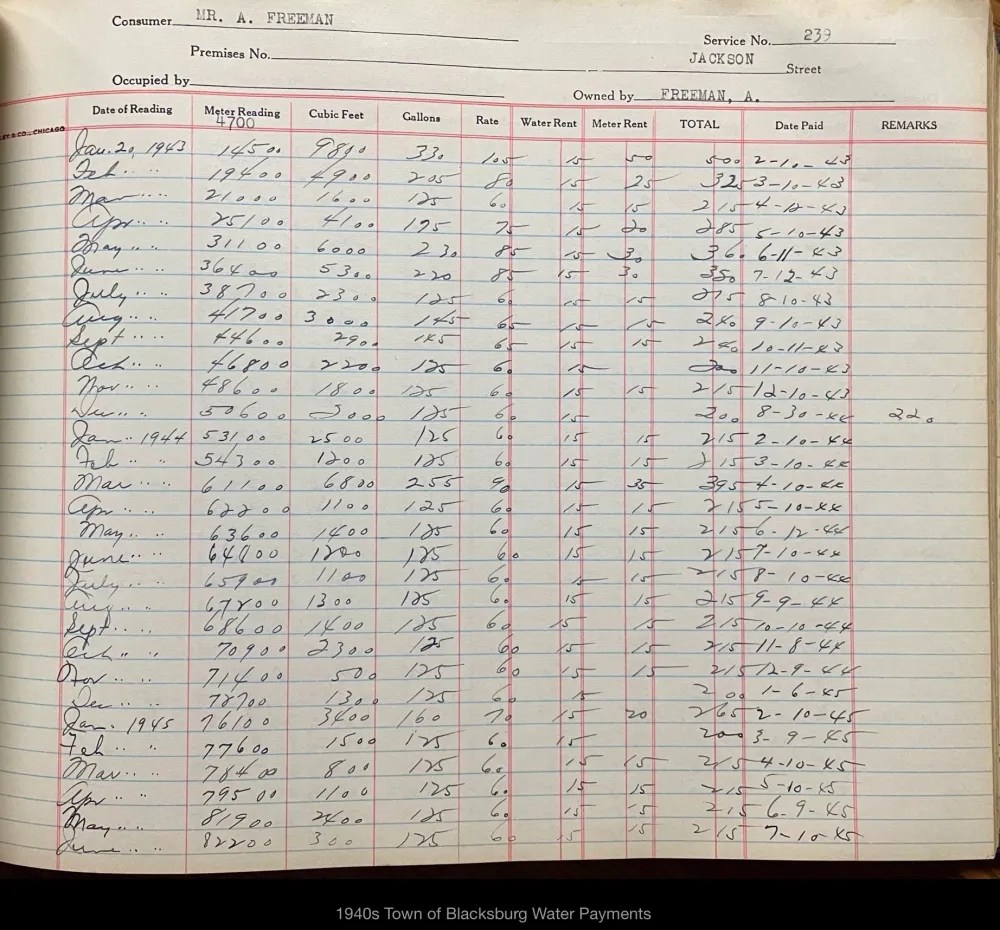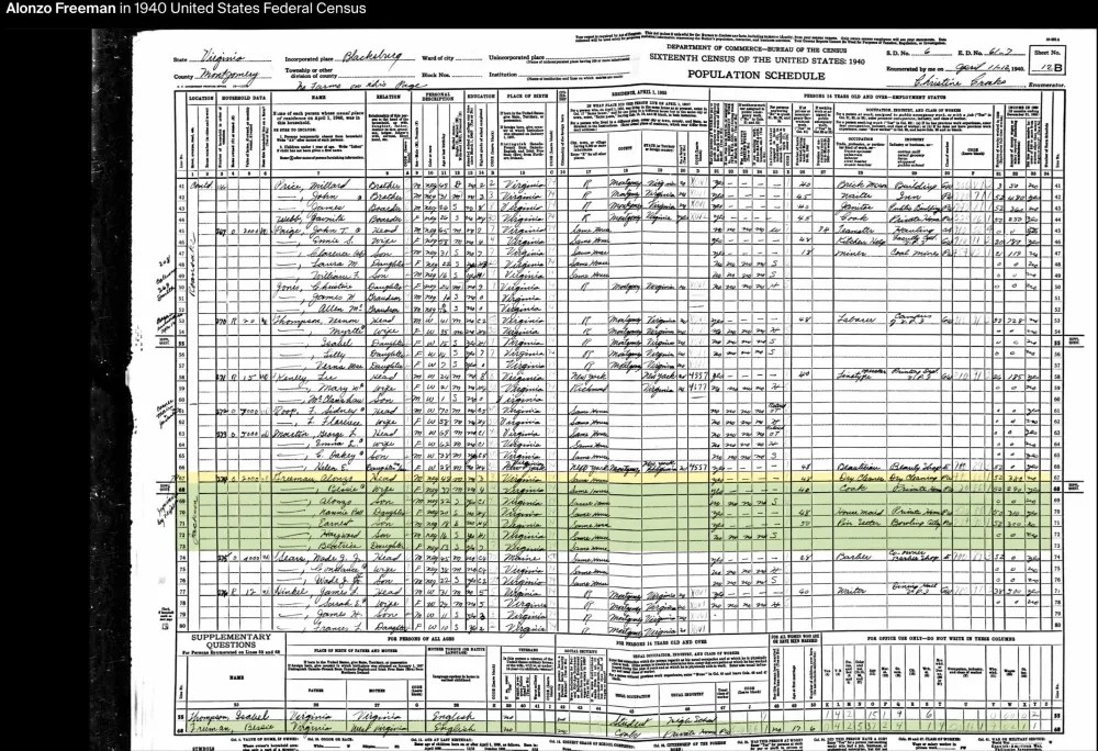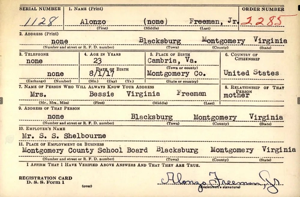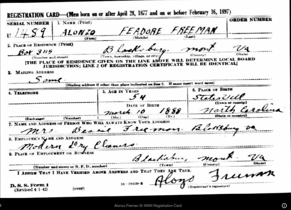 The 1940s marked a pivotal time for the Freeman family, as all the male members registered for the 1942 World War II Draft. These records provided Alonzo Sr.’s full name, Feadore, and documented his business, Modern Dry Cleaners (featured on an early 1950s map of Blacksburg). During this time, Alonzo Jr. served as the principal of the Clay Street Graded School, Linwood worked at the Radford Ordnance Works, and Haywood was employed by Ray Taylor.