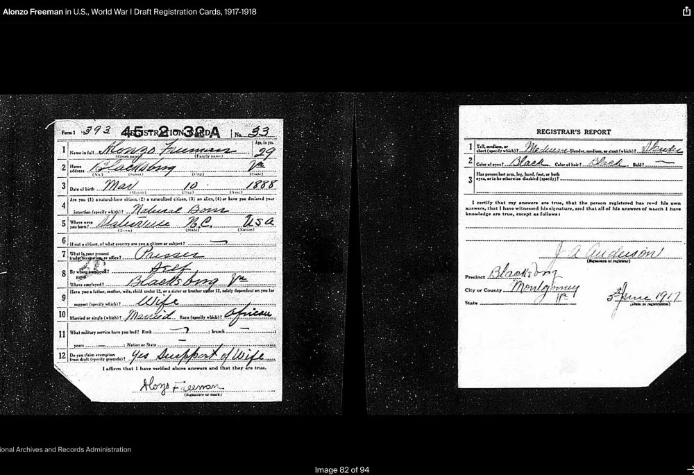 On April 5, 1917, Alonzo married Bessie Virginia Briggs (1899–1976) in Cambria, Virginia. Just a few months later, on July 31, 1917, their first son, Alonzo Freeman Jr., was born in Cambria, Virginia. According to his birth certificate, Alonzo Sr. worked as a waiter and clothes presser at Mountain Lake Resort, Virginia, while Bessie was a cook. During this time, they may have been living with Bessie’s mother and stepfather, who resided near the railroad tracks in Cambria.