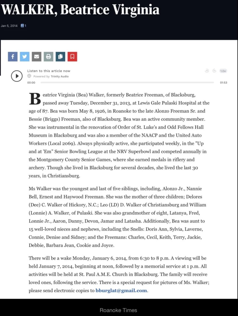 In 2013, Beatrice Freeman Walker, the youngest daughter of Bessie and Alonzo Freeman, participated in an oral history interview now archived at Virginia Tech University Libraries. In this interview, she shared valuable insights into her mother’s work in the homes of prominent community members and her leadership in the Independent Order of St. Luke’s (St. Frances Council #235), which operated out of the shared building in New Town alongside the Odd Fellows and the Household of Ruth. Beatrice also highlighted her mother’s important role in coordinating the return of soldiers for family funerals through the Red Cross.