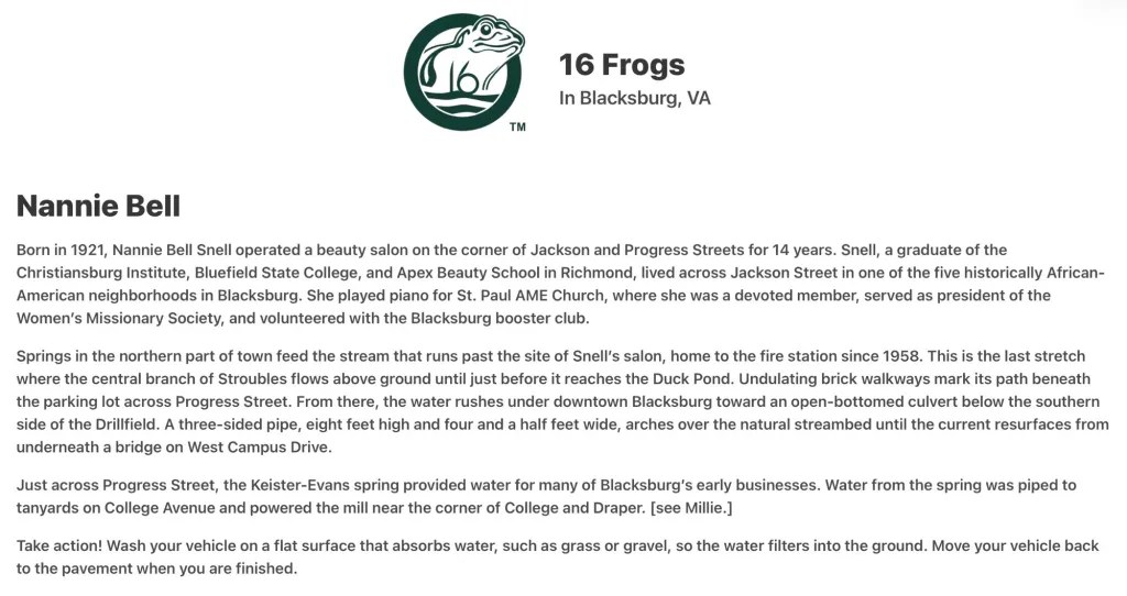 On November 19, 1947, Nannie Bell, now a beautician, married Sidney Grant Snell (1921–1975), a mechanic from Radford. The Snells raised six children and lived at 404 Jackson Street, just down the street from Nannie Bell’s parents, Alonzo and Bessie, who resided at 202 Jackson Street. Neither home remains standing today, but the Freeman residence was located at the same corner of Jackson and Progress Streets where the town’s 1958 firehouse #1 now stands. Blacksburg named a frog to honor Nannie Bell.