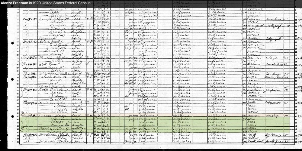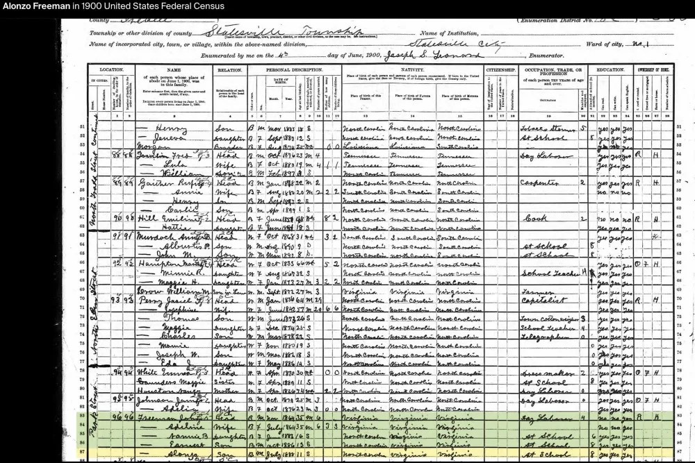 Alonzo Feadore (Fearno) Freeman, Sr. was born on March 10, 1889, in Statesville, North Carolina, to John (b. circa 1864) and Adeline Freeman (b. circa 1864). By the 1900 U.S. Census, John, a day laborer, and Adeline were living with their three children: Nannie B. (b. June 1883), Earnest (b. October 1886), and Alonzo Sr. (b. July 1888, student).