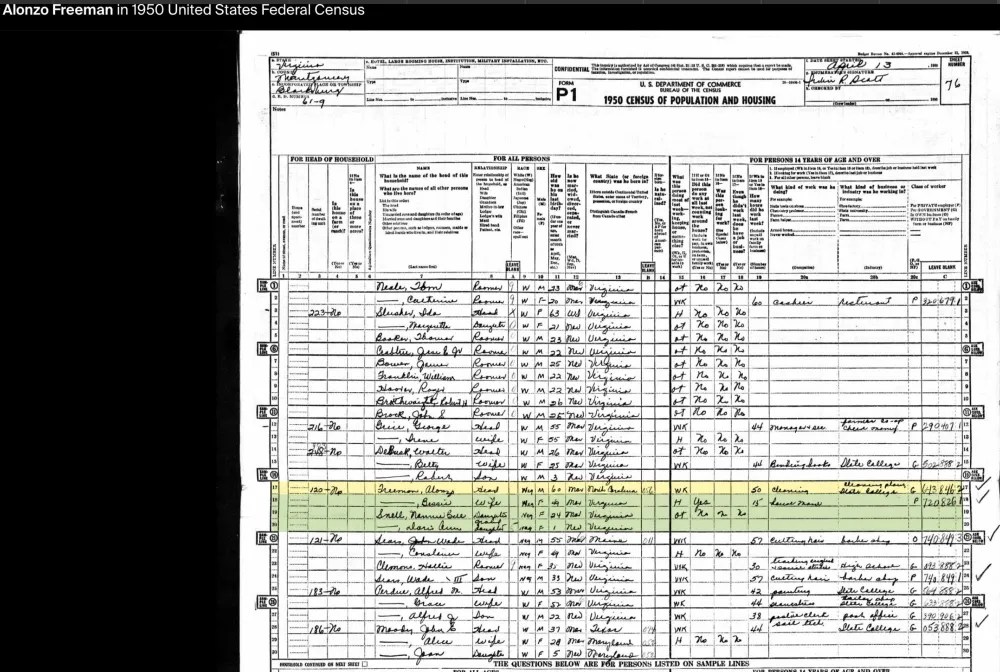 By the 1950 U.S. Census, Alonzo Sr., now in his 60s, was working at Virginia Polytechnic Institute’s Cleaning Plant. Nannie Bell and her daughter, Doris Ann, were living with her parents at the family home. By this time, all three Freeman sons had moved to Washington, D.C., with Linwood living alongside Haywood. Alonzo Jr. had married and was serving as the principal of the Clay Street, eventually he moved to Baltimore to be the principal of an elementary school.