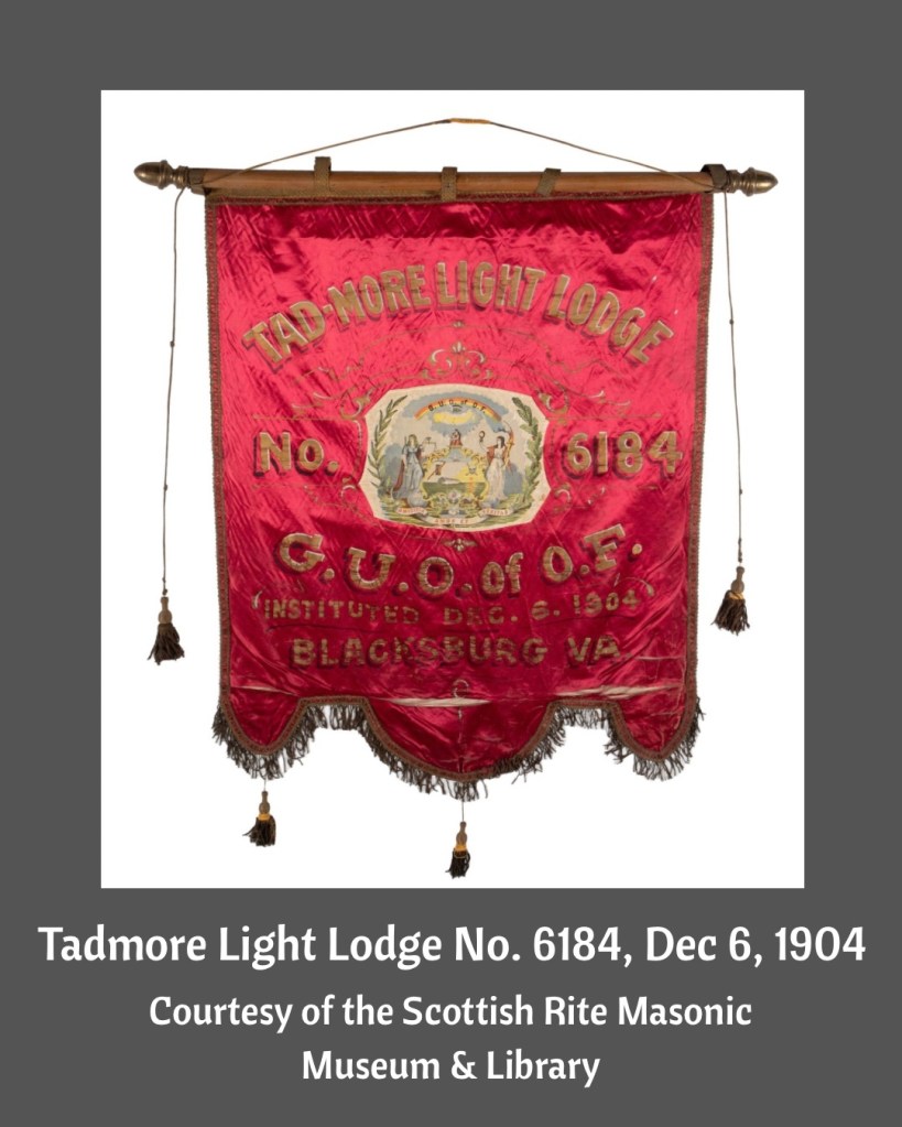 By the early 1900’s the GUOOF in the United States reported over 200,000 members with more than 2,000 established lodges. Roanoke Lodge No. 3225 was granted a dispensation on March 13, 1890. The Finance Book for the Household of Ruth (MS1988-009) reports that there was a relationship with the lodge in Christiansburg and the Grand Lodge in Roanoke, indicating that the Roanoke lodge was the progenitor of both the Blacksburg and Christiansburg lodges. The Blacksburg lodge, Tadmore Light No. 6184, is represented by a banner now preserved in the Scottish Rite Masonic Museum and Library in Massachusetts, which clearly records the lodge’s institution date as December 6, 1904.